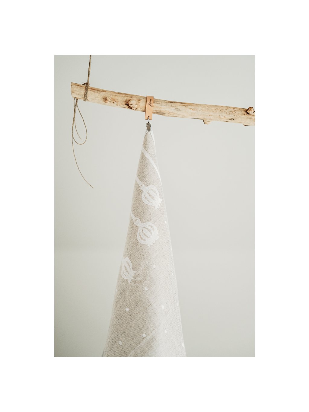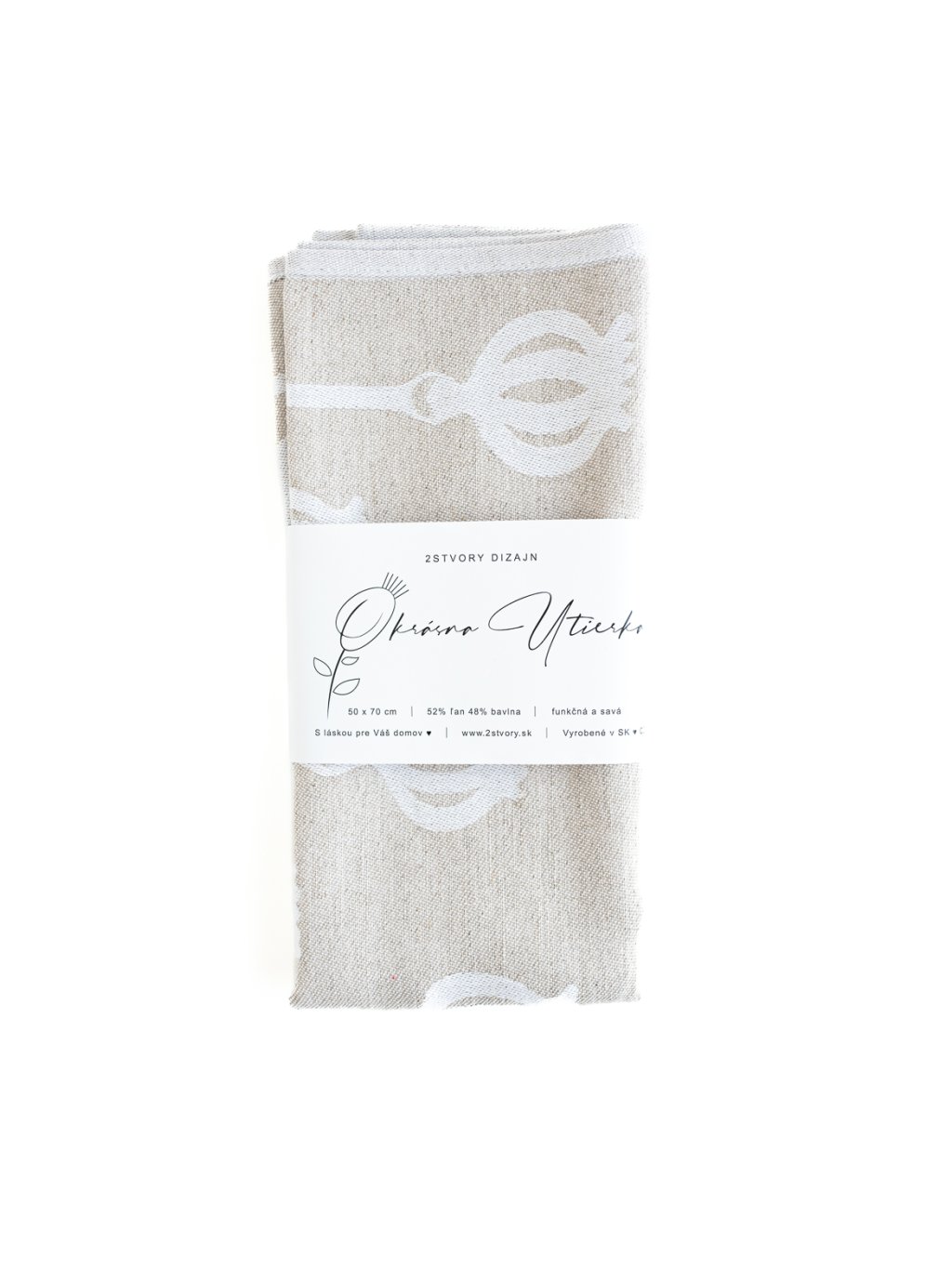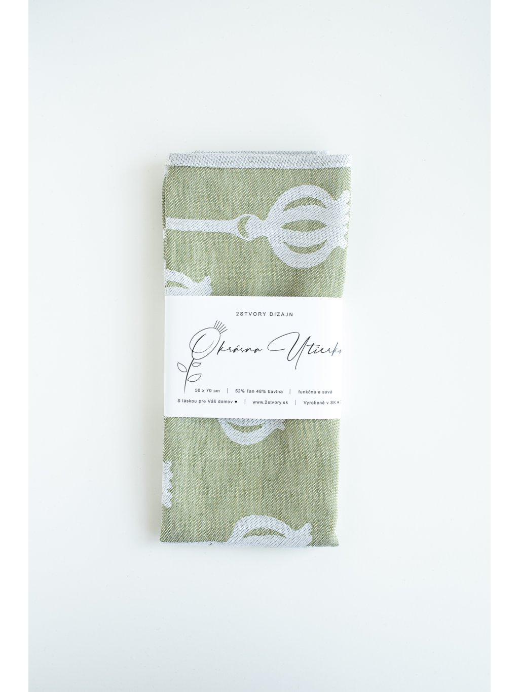 Produkty v sade sú ušité z našej autorskej žakárovej látky tkaním z kvalitných európskych priadzí, s rešpektom k tradičnému remeslu aj k prírode. Kombinácia ľanu a bavlny zaručuje výnimočnú pevnosť, výbornú savosť a prirodzene krásny vzhľad. Vďaka žakárovému tkanému vzoru má každá strana látky jedinečný charakter. Môžete si vybrať z neutrálnej prírodnej farby a olivovo zelenej farby.