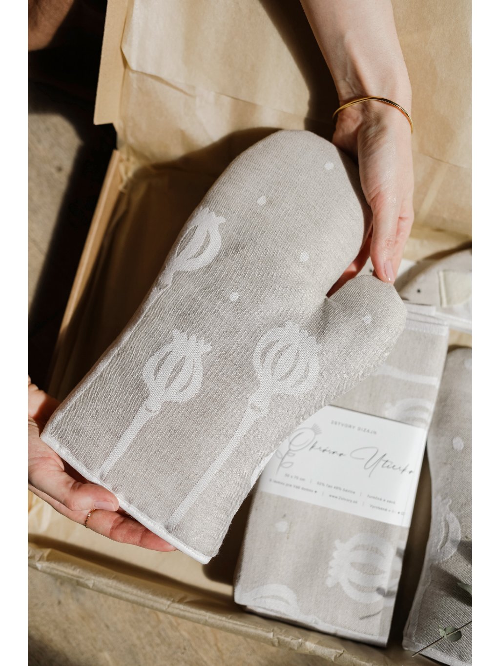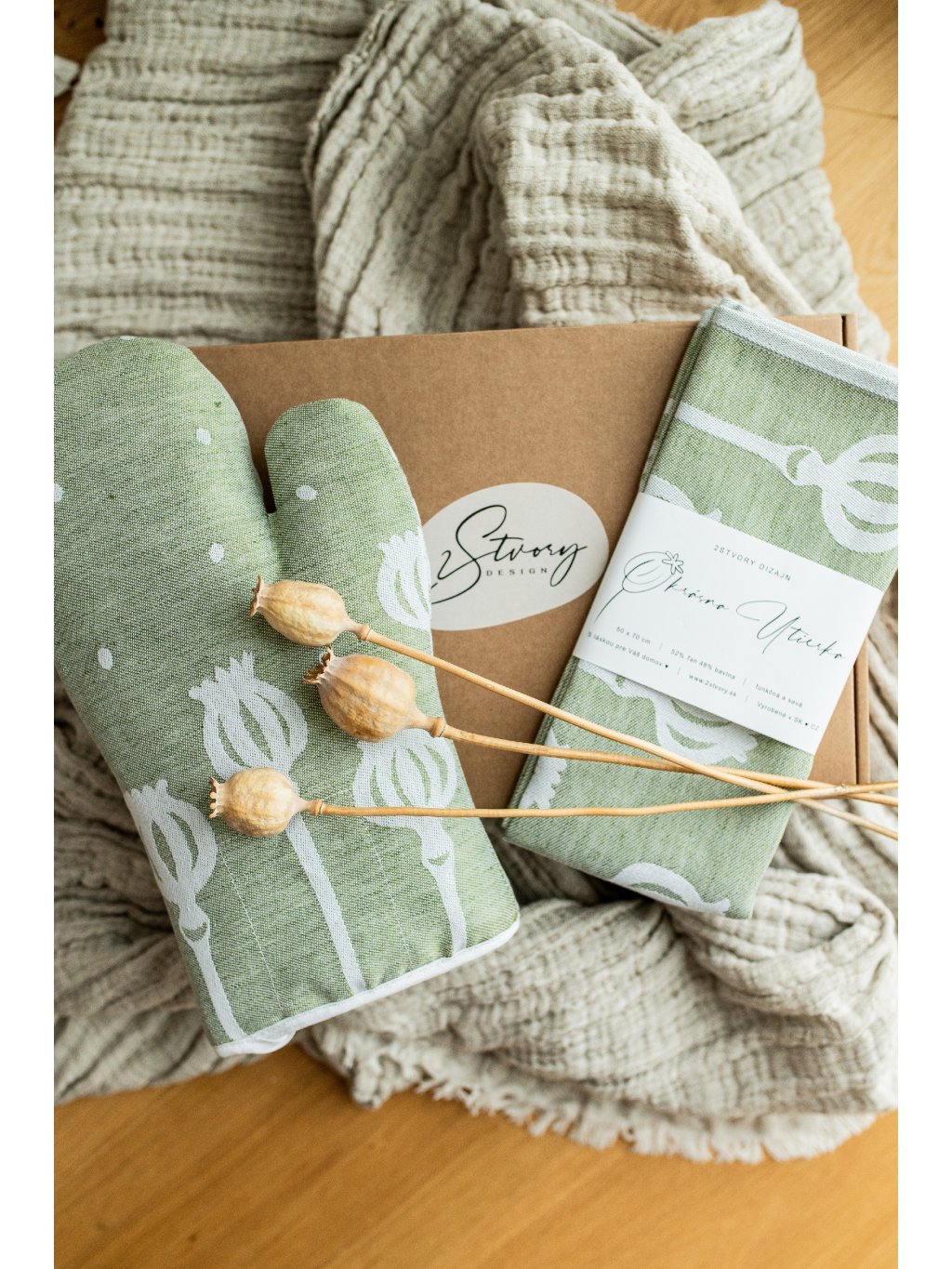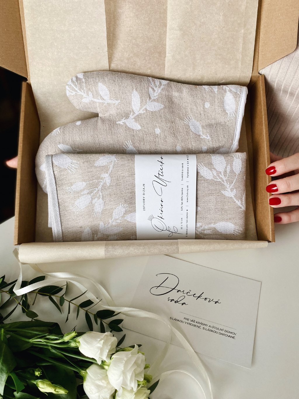 V tomto darčekovom balení nájdete 1x žakárovú kuchynskú utierku a 1x žakárovú kuchynskú rukavicu v rovnakom dizajne, darčekovú kartičku s venovaním a drobnú ozdobu (sušený kvietok/makovička).