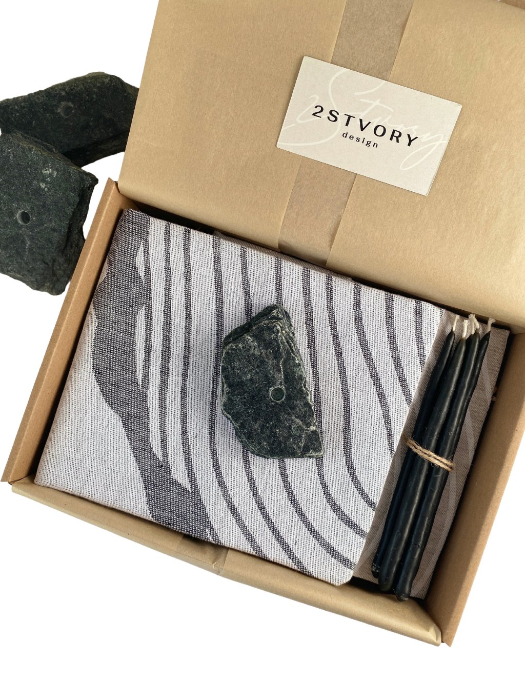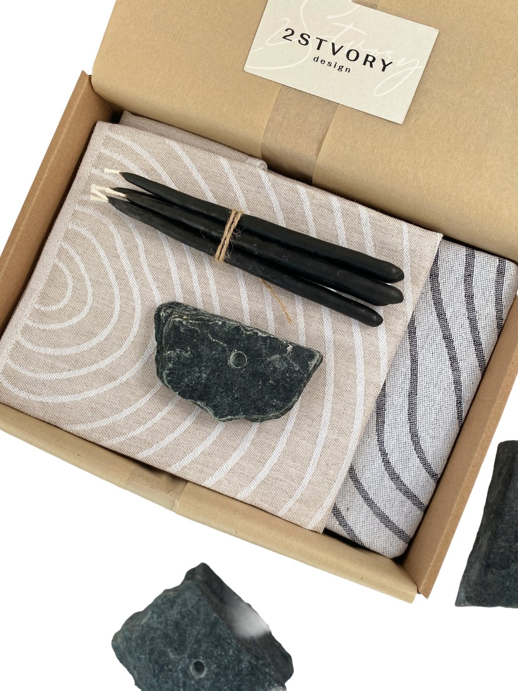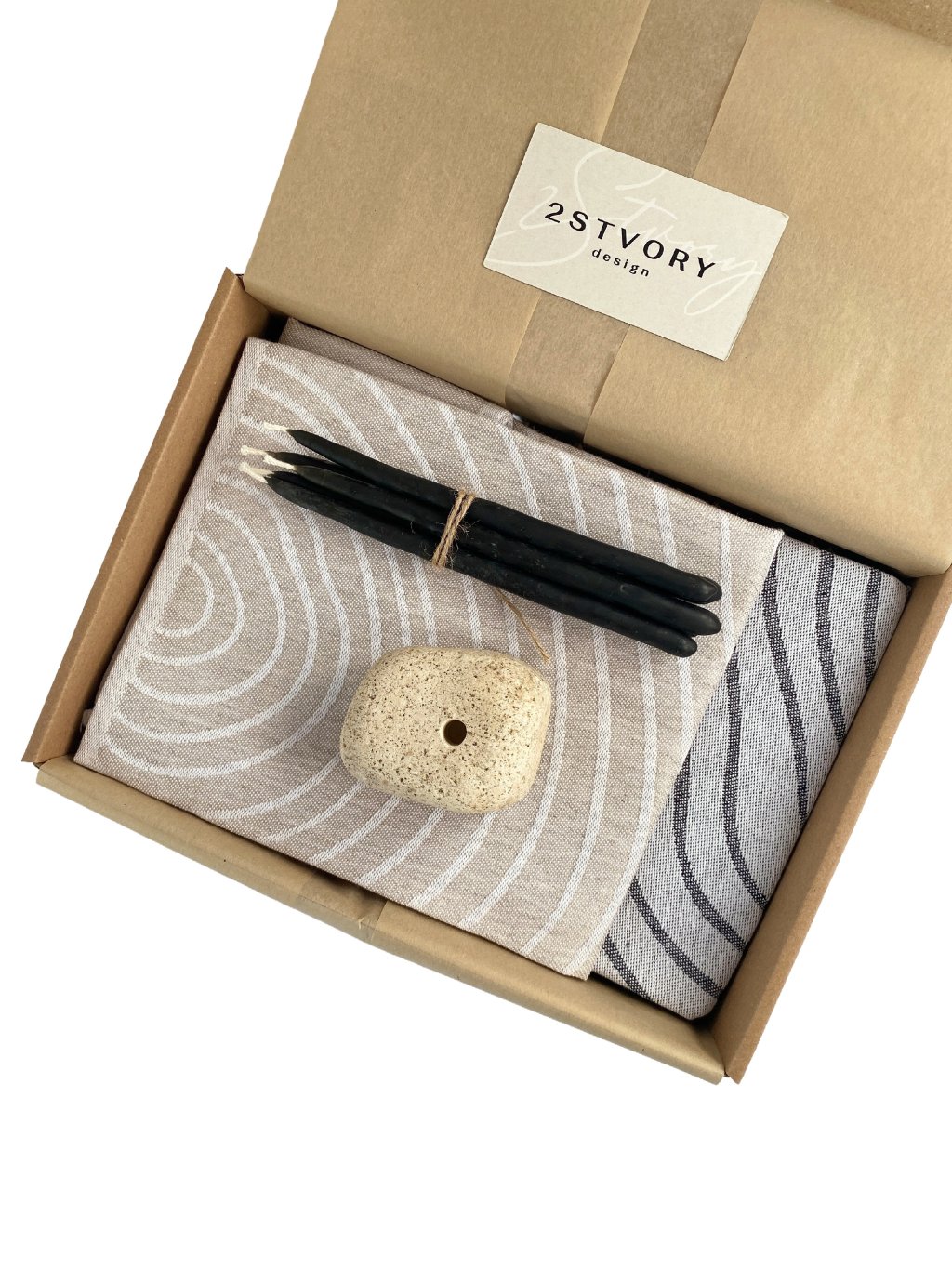 Darčeková sada obsahuje: 2 tkané kuchynské utierky z našej najnovšej kolekcie Tempora inšpirovanej plynutím času a krásou jednoduchosti, 5 čiernych ručne máčaných sviečok zo včelieho vosku a kamenný svietnik (môžete si vybrať tmavošedý alebo béžový kameň)