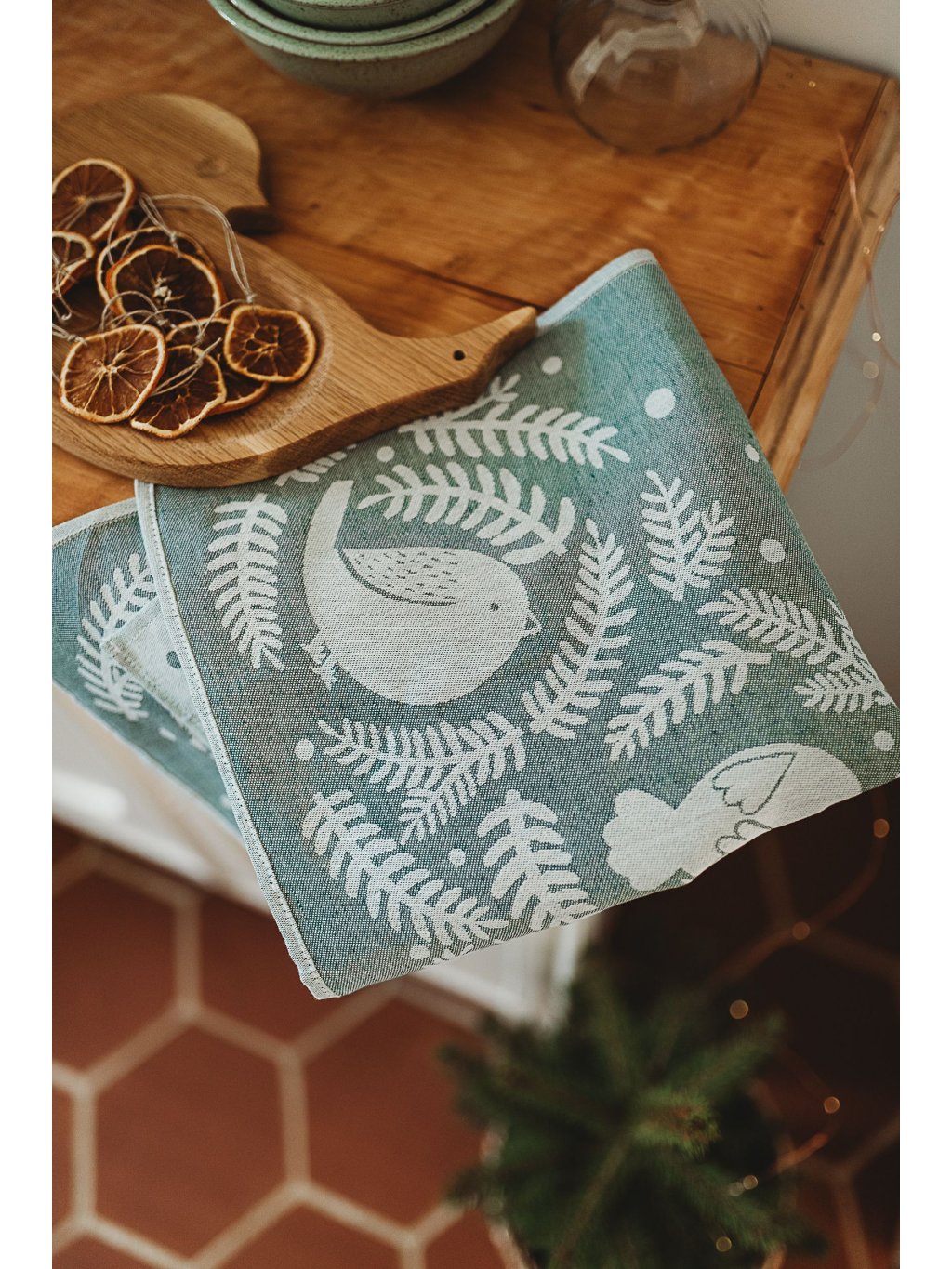 Linen kitchen towels with a delicate winter bird motif in natural colours are both an aesthetic and practical accessory.