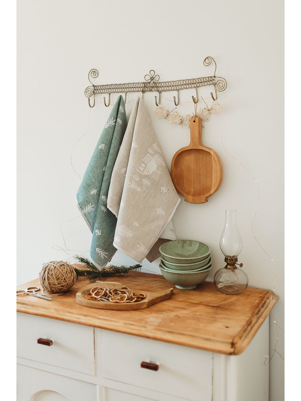 This kitchen tea towel, crafted from a linen-cotton blend and woven using the jacquard technique, comes in a beautiful forest green and ivory color. A customer favorite, this design brings a timeless charm to any kitchen.