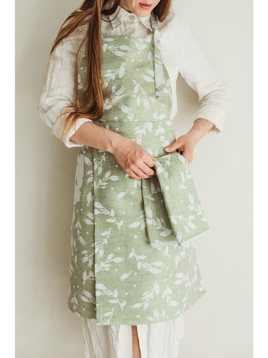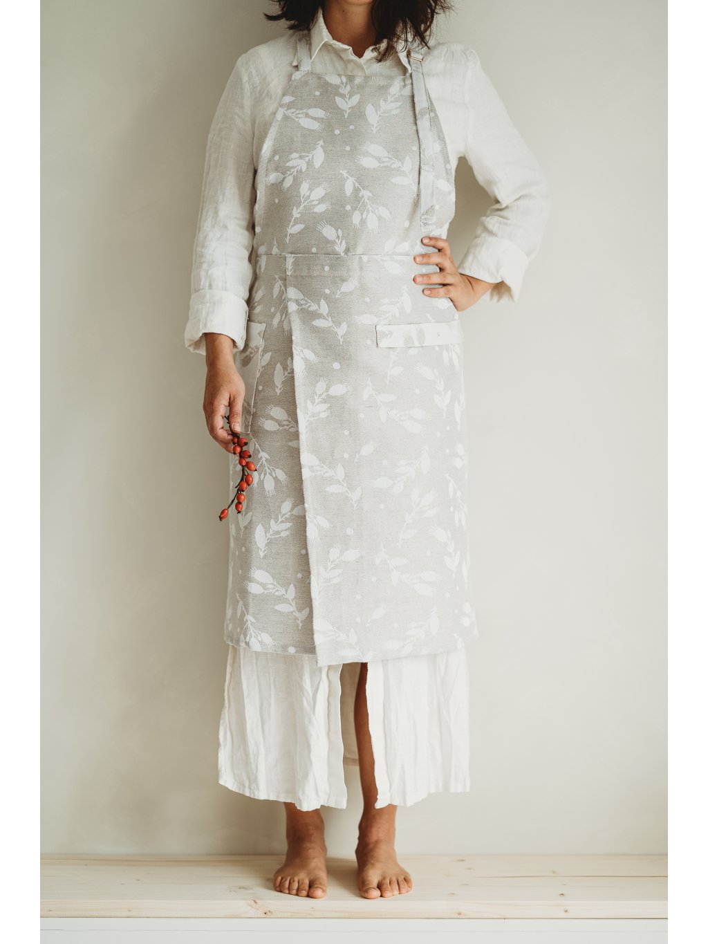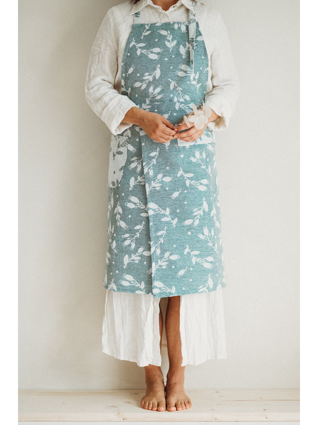 Apron dimensions: the total length, including the top part of the apron, is 85 cm, with additional adjustability via the neck tie. The width of the apron is 68 cm, plus the waist ties. Designed to fit all body types (S–XL) comfortably.