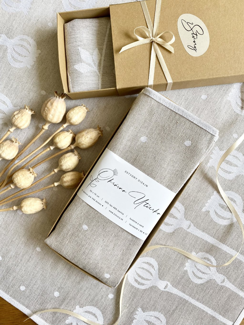 A jacquard kitchen towel woven from linen and cotton yarns, presented in a gift box.