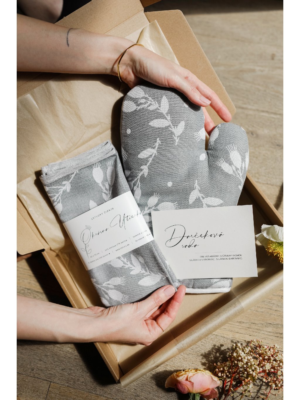 Surprise someone special with this premium housewarming gift featuring a jacquard kitchen linen set. This new home gift box for kitchen includes a matching jacquard set of kitchen towel and kitchen oven mitt.