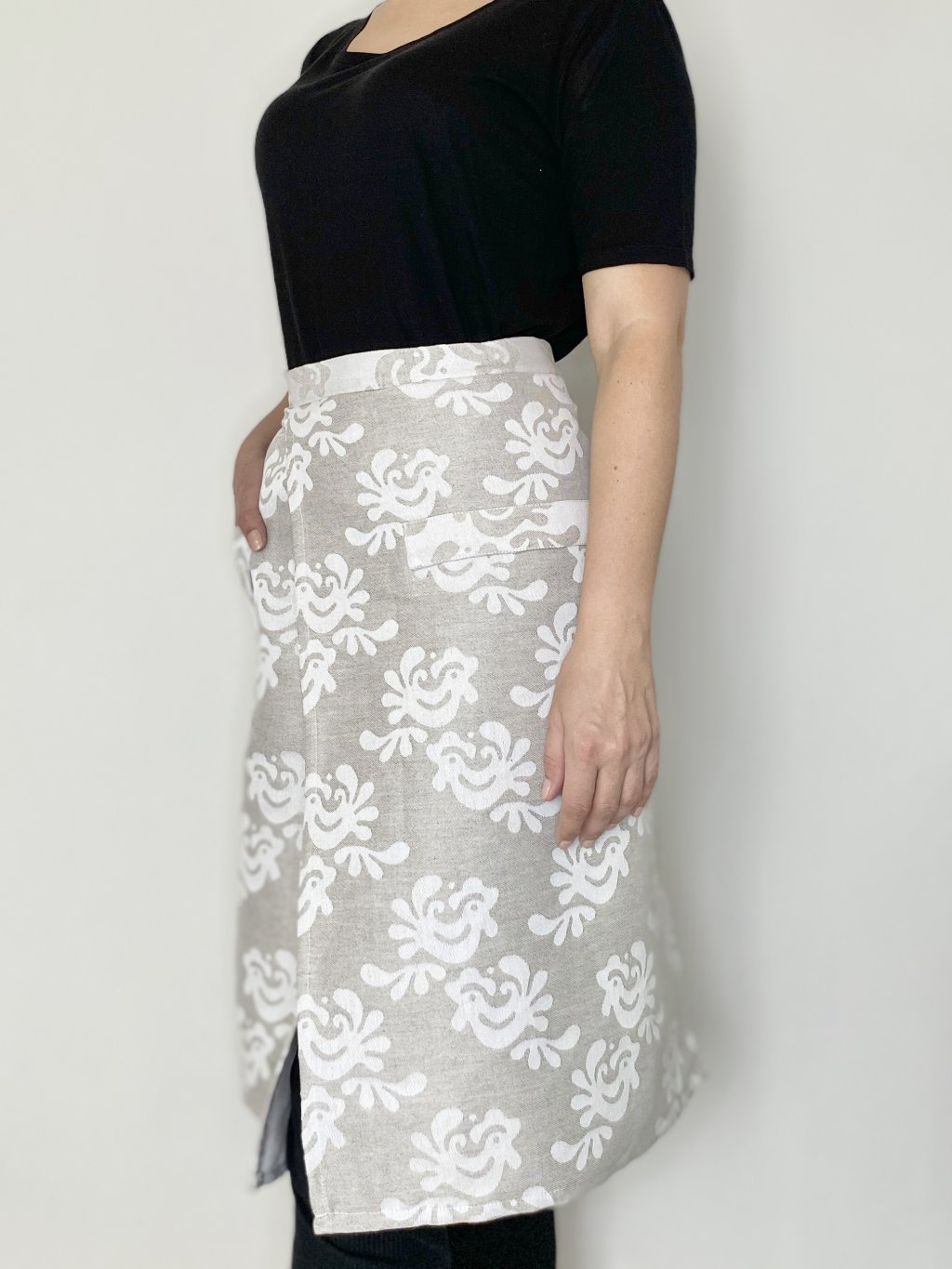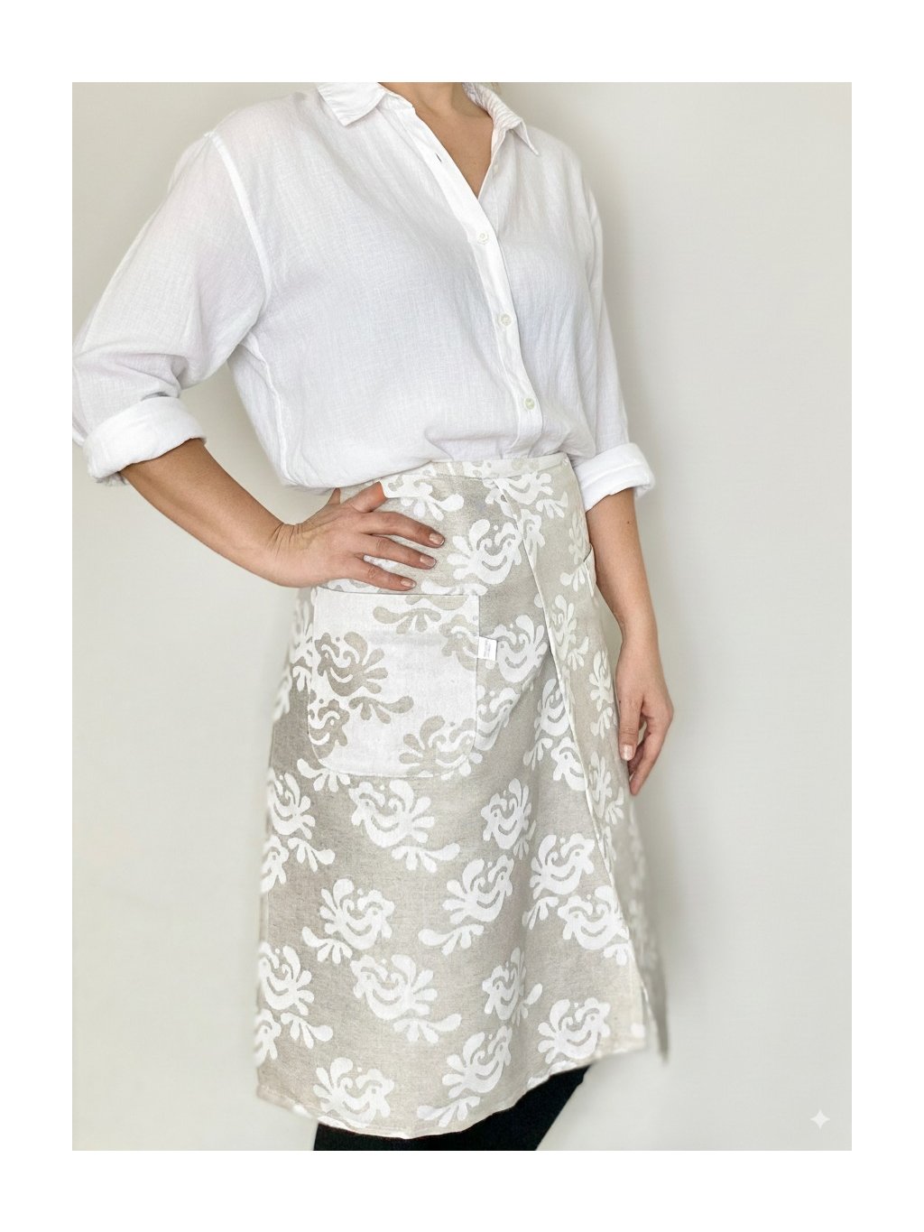 Táto ľanová kuchynská zástera je navrhnutá s dôrazom na eleganciu aj praktickosť – ideálna pre každodenné varenie, ale aj ako darček pre milovníkov štýlového bývania. Dizajn tkaniny vznikol v spolupráci s Ústredím ľudovej umeleckej výroby (ÚĽUV).