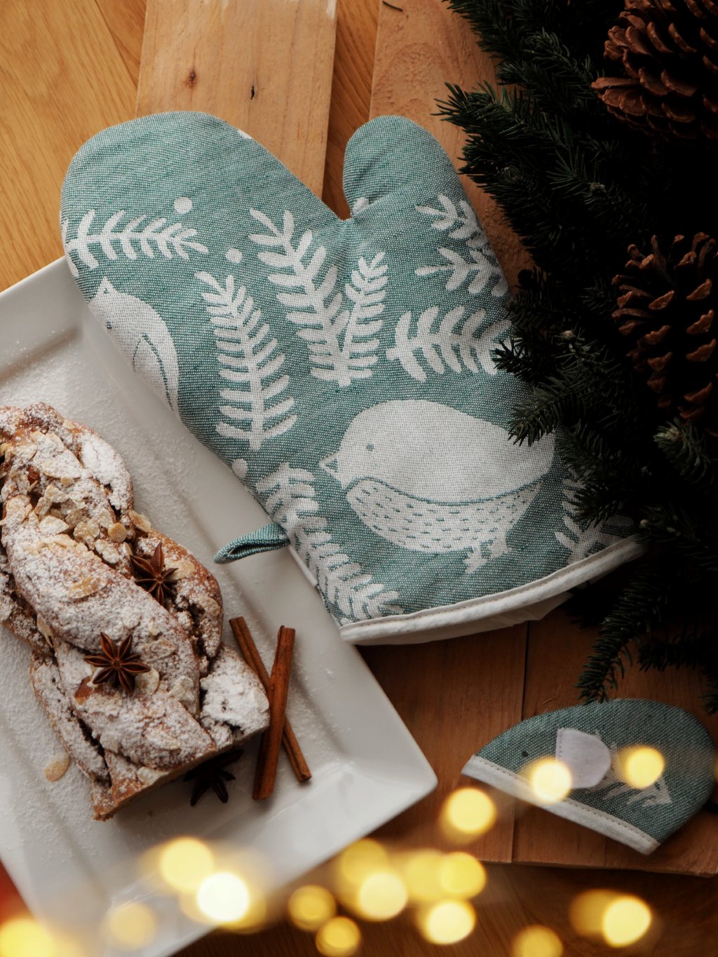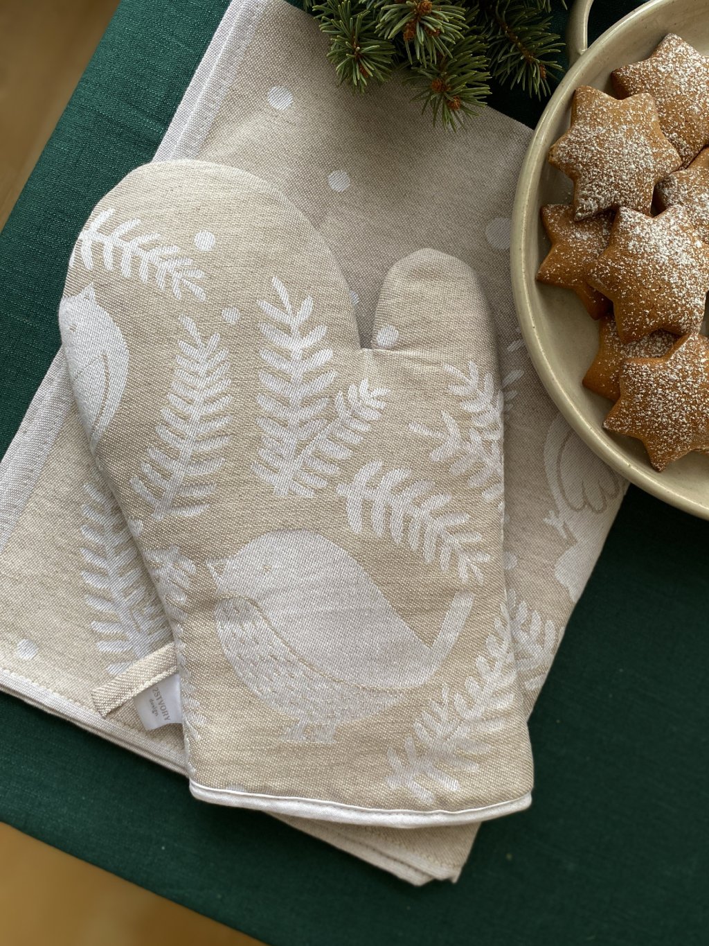 Ľanová kuchynská rukavica s motívom Birds ochráni vaše ruky pri každodennom varení a zároveň prinesie do kuchyne kúsok zimnej nálady. Je ušitá z mäkkej, no odolnej zmesi ľanu a bavlny – v jemnej farebnej palete, ktorú ľahko zladíte s ďalšími doplnkami 2STVORY.