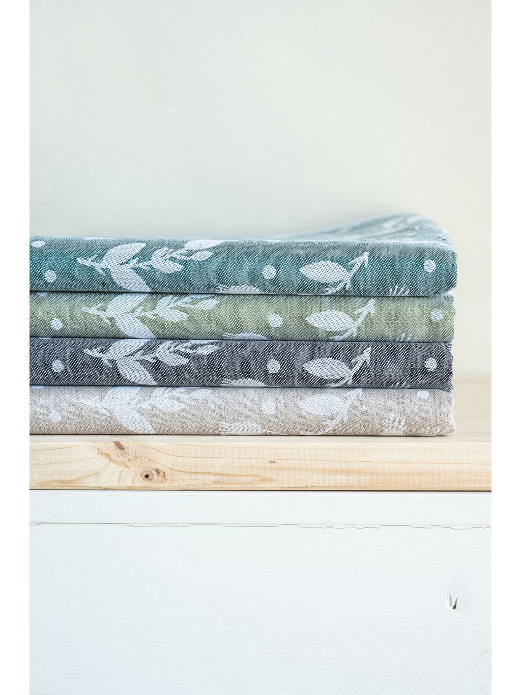 Farba a vzor: tmavozelená (dostupná tiež v prírodnej režnej (béžovej), šedej alebo olivovej farbe). Jemný motív šípok dodáva utierke nadčasový vzhľad a prirodzený šarm, ktorý bude ladiť s každým interiérom počas celého roka.