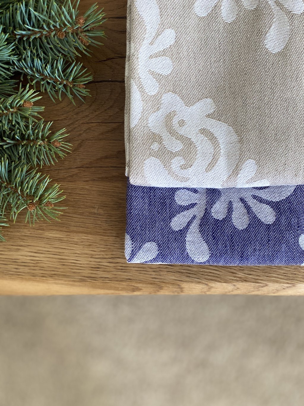 Farba a vzor: Prírodná režná alebo tmavomodrá. Žakárový vzor je inšpirovaný slovenskou výšivkou z trnavského regiónu – jemne tradičný, ale stále nadčasový.