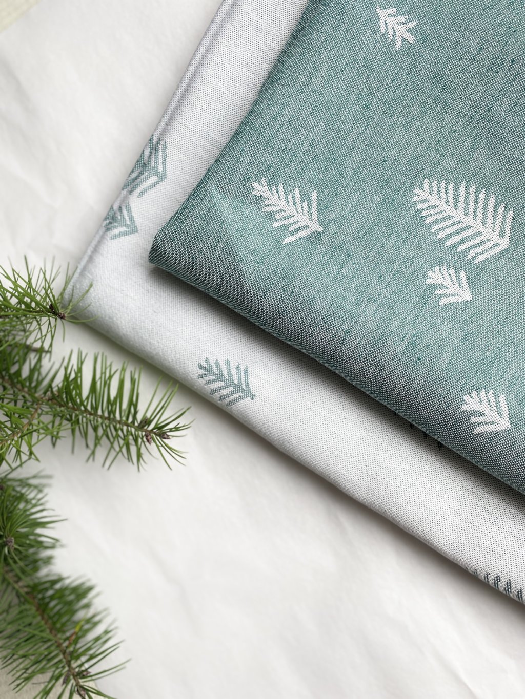 Farba a vzor: tmavozelená, s jemným motívom ihličnatých stromčekov a vtáčikov