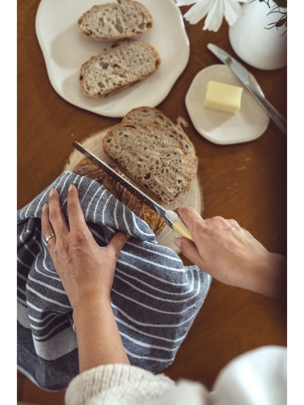 Dizajnový odkaz: Jemný žakárový vzor letokruhov je našou interpretáciou prírodného minimalizmu. Je to vizuálne čistý motív, ktorý v modernom interiéri pôsobí upokojujúco a sofistikovane. Vďaka tejto technike tkania je vzor na utierkach obojstranný. Každá strana ponúka inú vizuálnu dynamiku, čo z nich robí variabilný doplnok pre vaše stolovanie.
