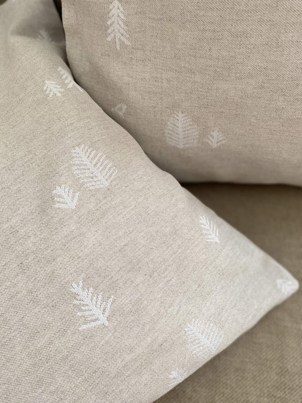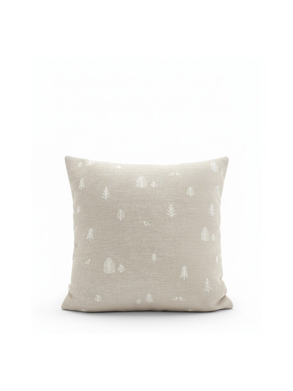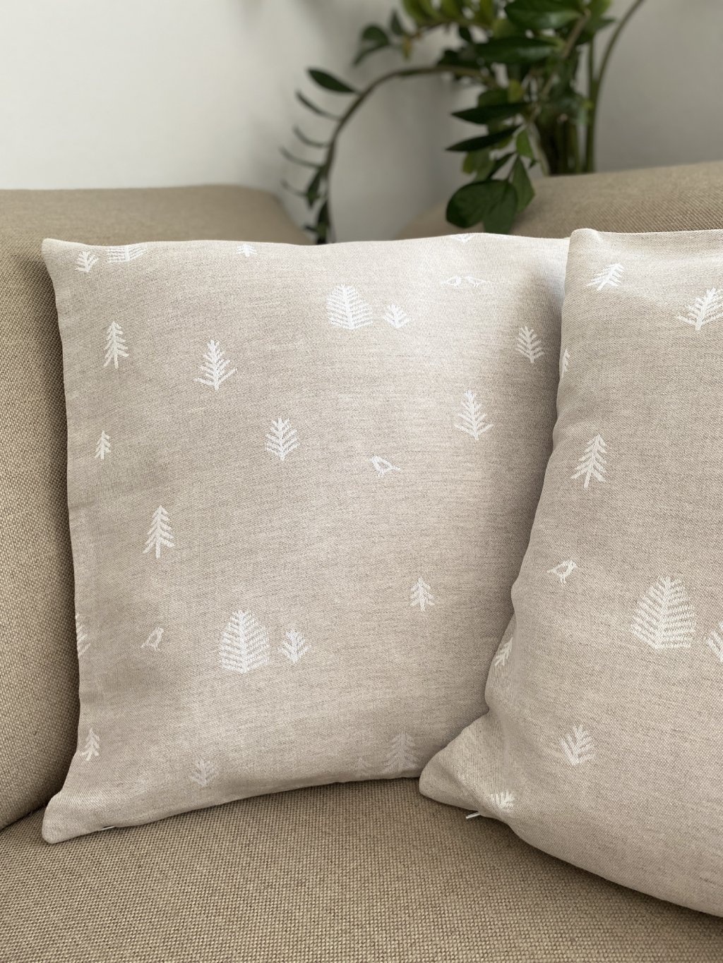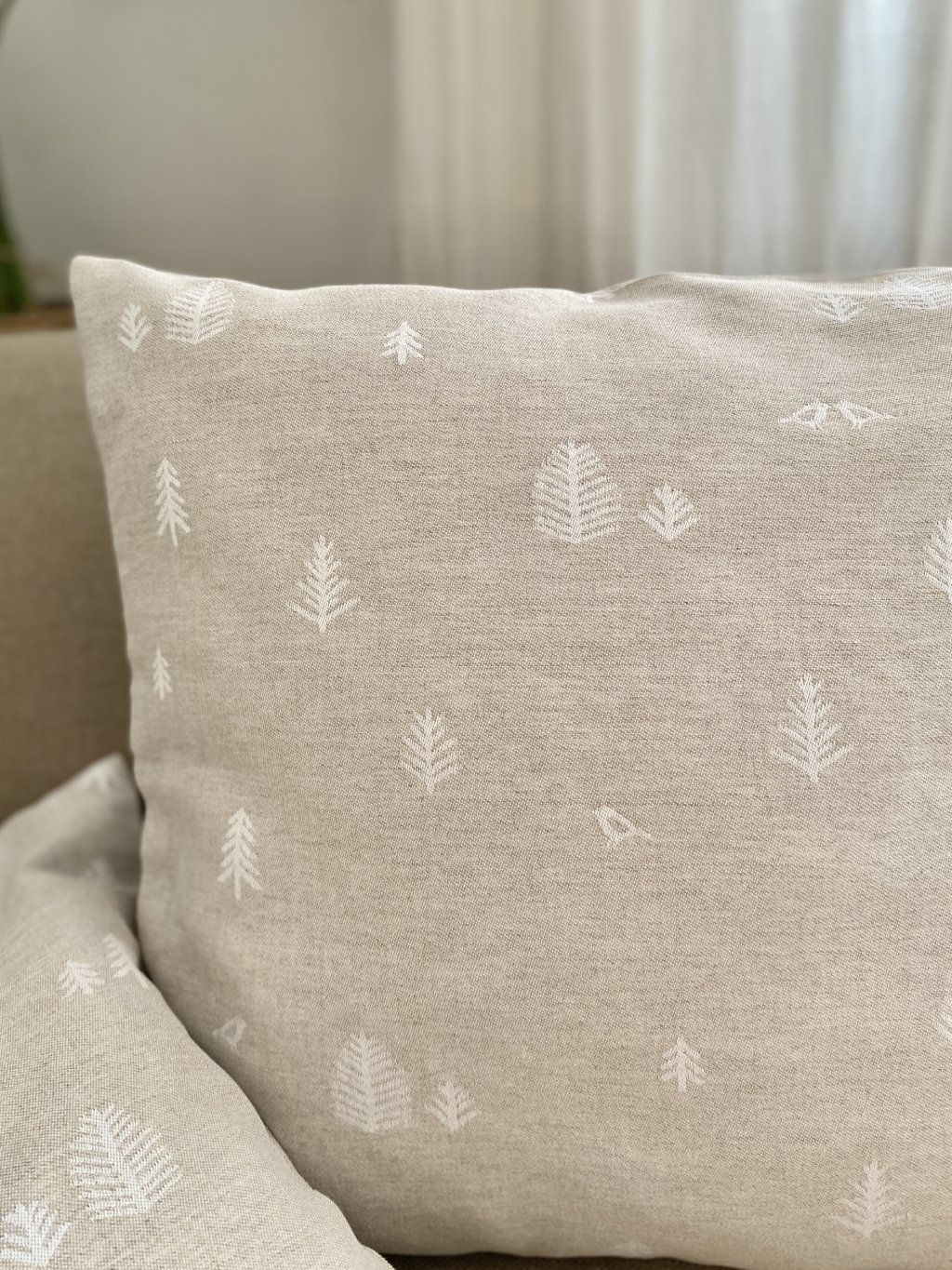 Jemný vzor ihličnatých stromov a vtáčikov v prírodnej farbe ľanu túto atmosféru príjemne dotvorí.