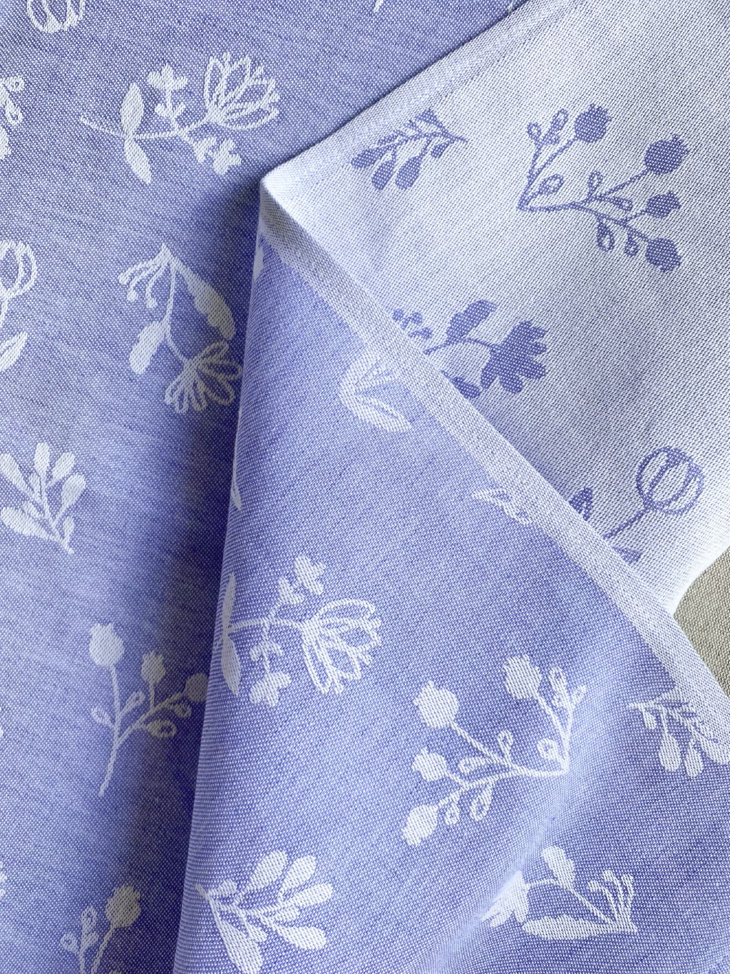 Vzor a dizajn: Autorský žakárový vzor Flowers v jemnom fialovom odtieni. Vzor je obojstranný – každá strana tkaniny má jedinečný vzhľad.