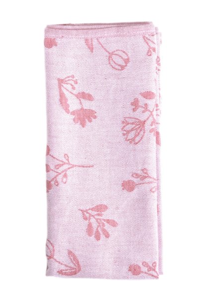 Ľanová kuchynská utierka s jemným kvetinovým žakárovým vzorom v jemnom ružovom odtieni – praktický aj estetický doplnok modernej kuchyne.
