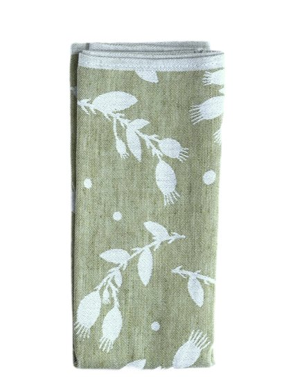 Žakárová kuchynská utierka s jemným vzorom makovičiek v prírodných alebo olivových tónoch tkaná z prírodných ľanových a bavlnených priadzí.